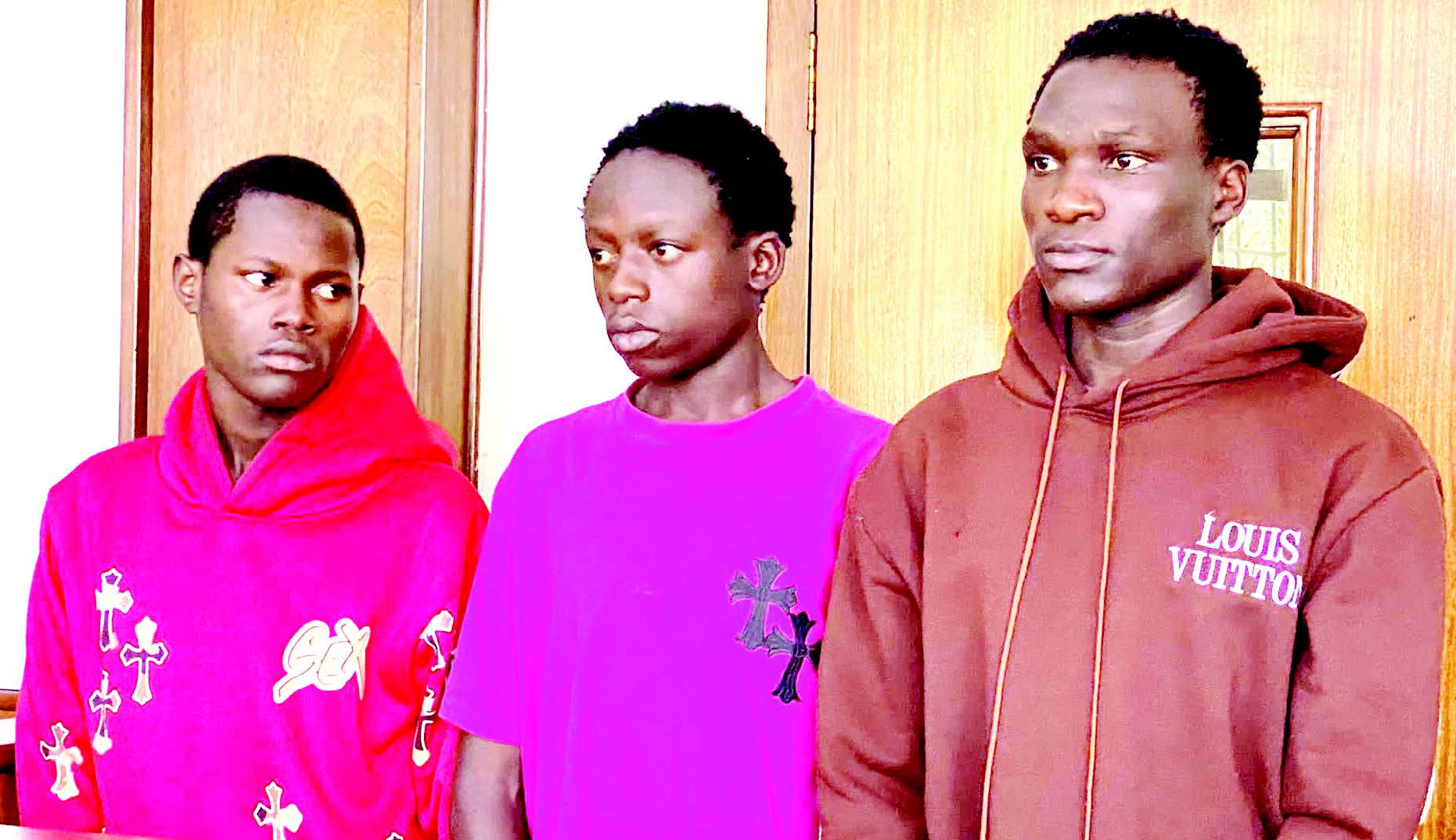 Abavubuka basatu okuli; Arafat Isabirye 18, ow’e Nampikiri mu munisipaali y’e Iganga mu disitulikiti y’e Iganga, Zubairi Kakaire 18, ow’e Mutambala mu disitulikiti y’e Iganga ne Sharif Egesa 18, nga naye w’e Iganga baasimbiddwa mu maaso g'omulamuzi Winnie Nankya Jatiko ku kkooti ya Buganda Road n'abasomera omusango gw’okukozesa obubi kompyuta okunyaga abantu.