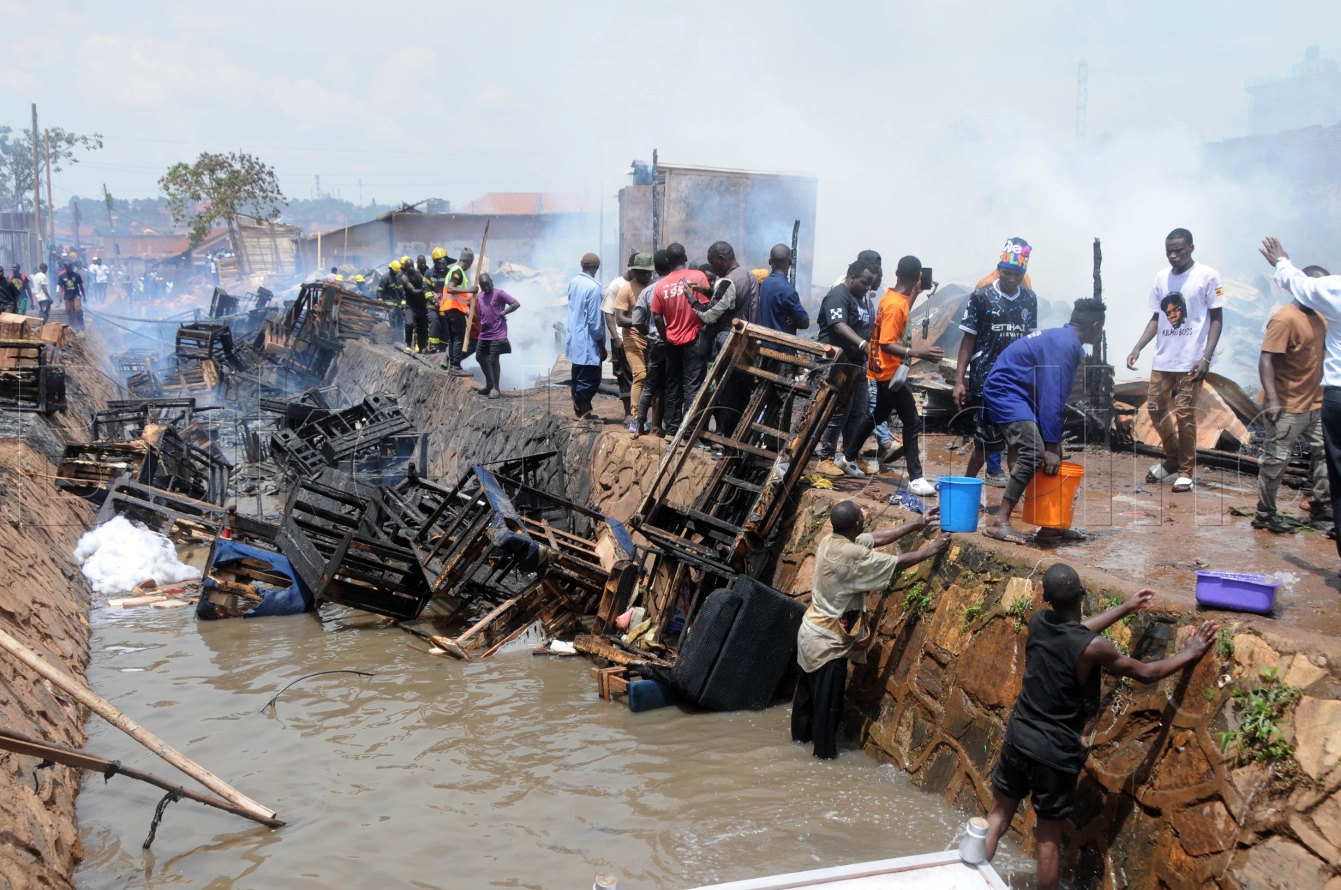 Julius Kakooza omu baabaddewo yagambye nti omuliro gwatandikidde mu kibanda kya Davi ng’esaawa zaabadde zigenda mu mukaaga wabula abavubuka abaazze ng’abaddukirize ate bazze mu kubba ebintu by’abasuubuzi ekyawalirizza amagye ne poliisi okukuba amasasi mu bbanga okubagumbulula ate abalala bazze ku mmere eyabadde mu woteeri ne bagirya .