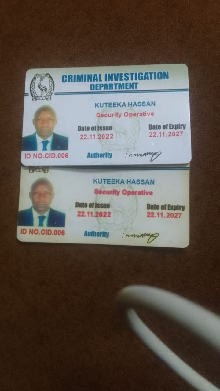 Hassan Kuteeka 38, omutuuze mu zzooni ya Musigula mu Rubaga mu Kampala, y'agambibwa okusangibwa ne kkaada ya poliisi nnamba { No. CID 006 } era ng'eraga nti ava mu kitongole kya bambega ekya poliisi.