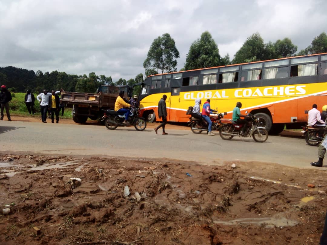 Akabenje kabadde mu kifo awaali Banyankole Kweterana factory e Busenyi, bbaasi ya Global nnamba UBE 159 N Isuzu ebadde eva e Ishaka ng'eyolekera Mbararara bw'etomedde tipper.