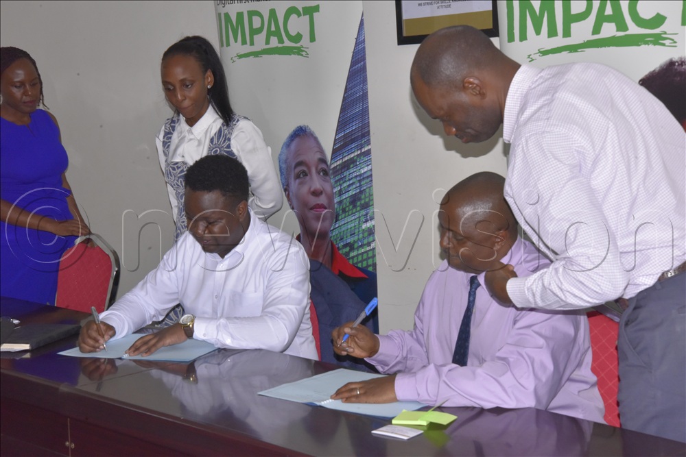 NVTC Principal Robert Baguminsiriza  (right) being guided on some of the technical issues while signing the MOU with Schneider electrics' general manager,  Schneider Electric General Manager Josiah Habwe on Tuesday afternoon. Looking on is EACOP’s National Content Capacity Building Lead, Natasha Kassam and her colleague from EACOP. (Photos by Moses Kigongo)