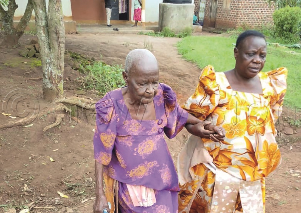 Nanyonjo being assisted by her daughter Namatovu. Namatovu and her mother are now embroiled in a dispute with Amos Mwesigye and Davis Mugabi, also known as Safari, who initially approached the family seeking to help them recover their land at Bukutu village in Bukwiri town council, Kyankwanzi district, from land grabbers.
