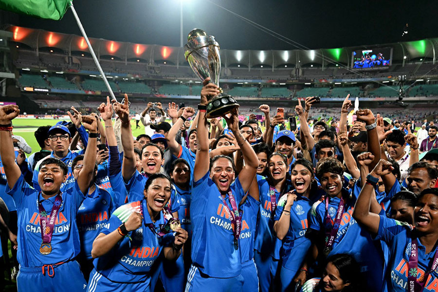 India’s players celebrate with the trophy after winning the ICC Women's Cricket World Cup 2025 one-day international (ODI) final match between India and South Africa at the DY Patil Stadium in Navi Mumbai on November 3, 2025.AFP PHOTO